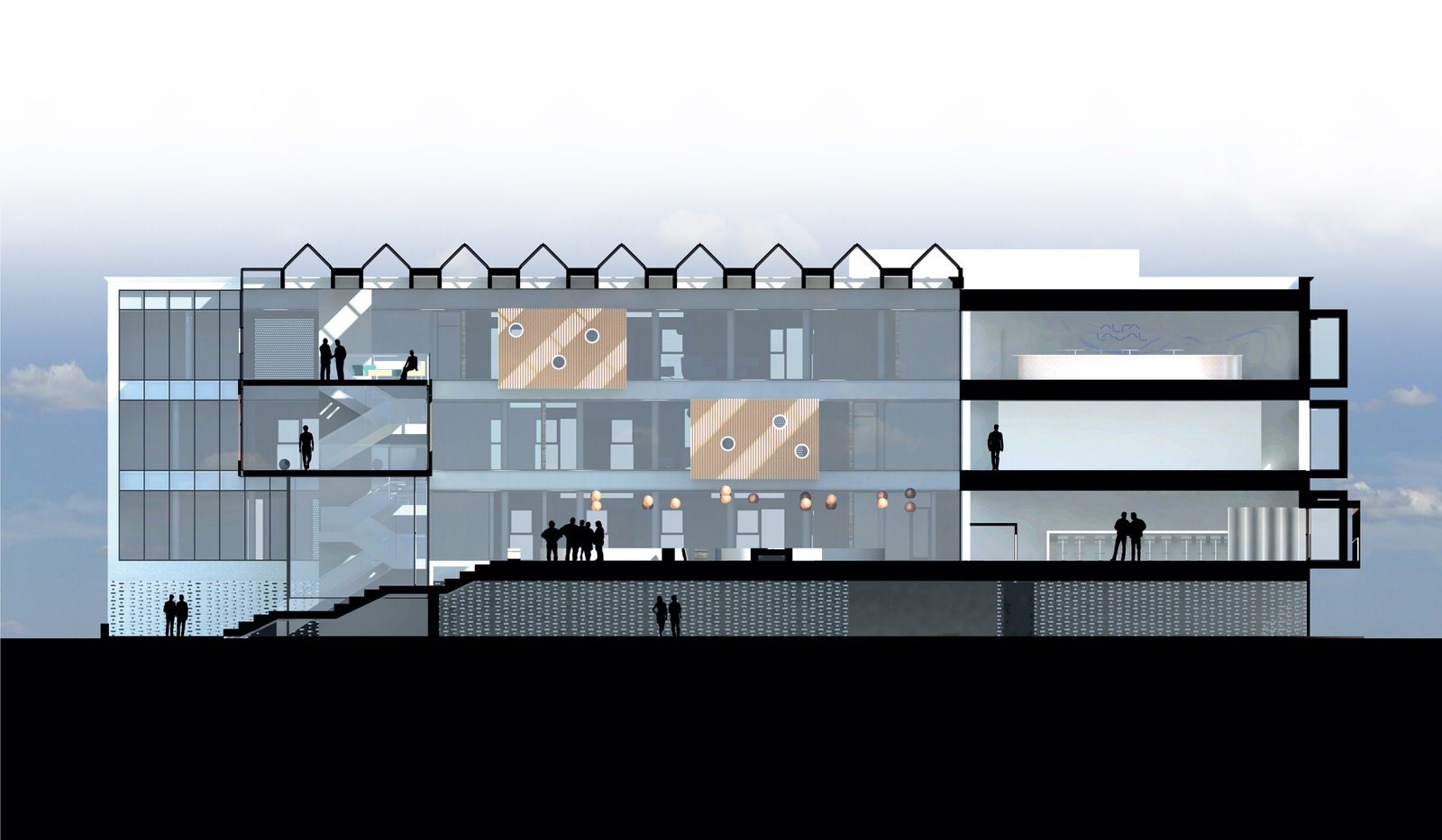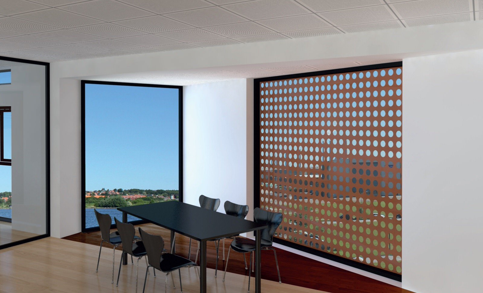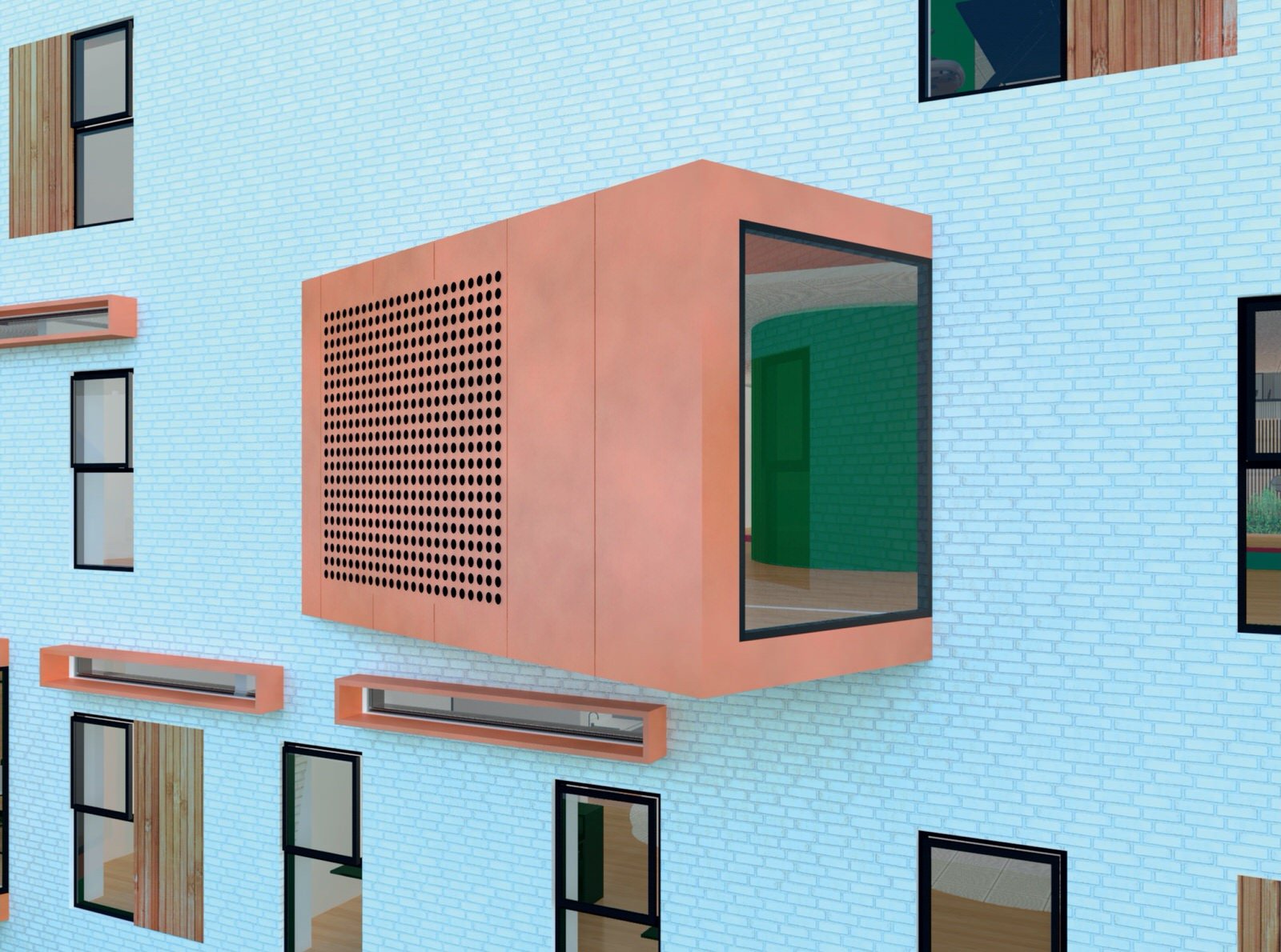 Det maritime miljø i området er trukket ind via materialevalget af kobber og skibsplanker, samtidig med at “Broen” giver en fornemmelse af at stå på et skib og kigge ud over havet.